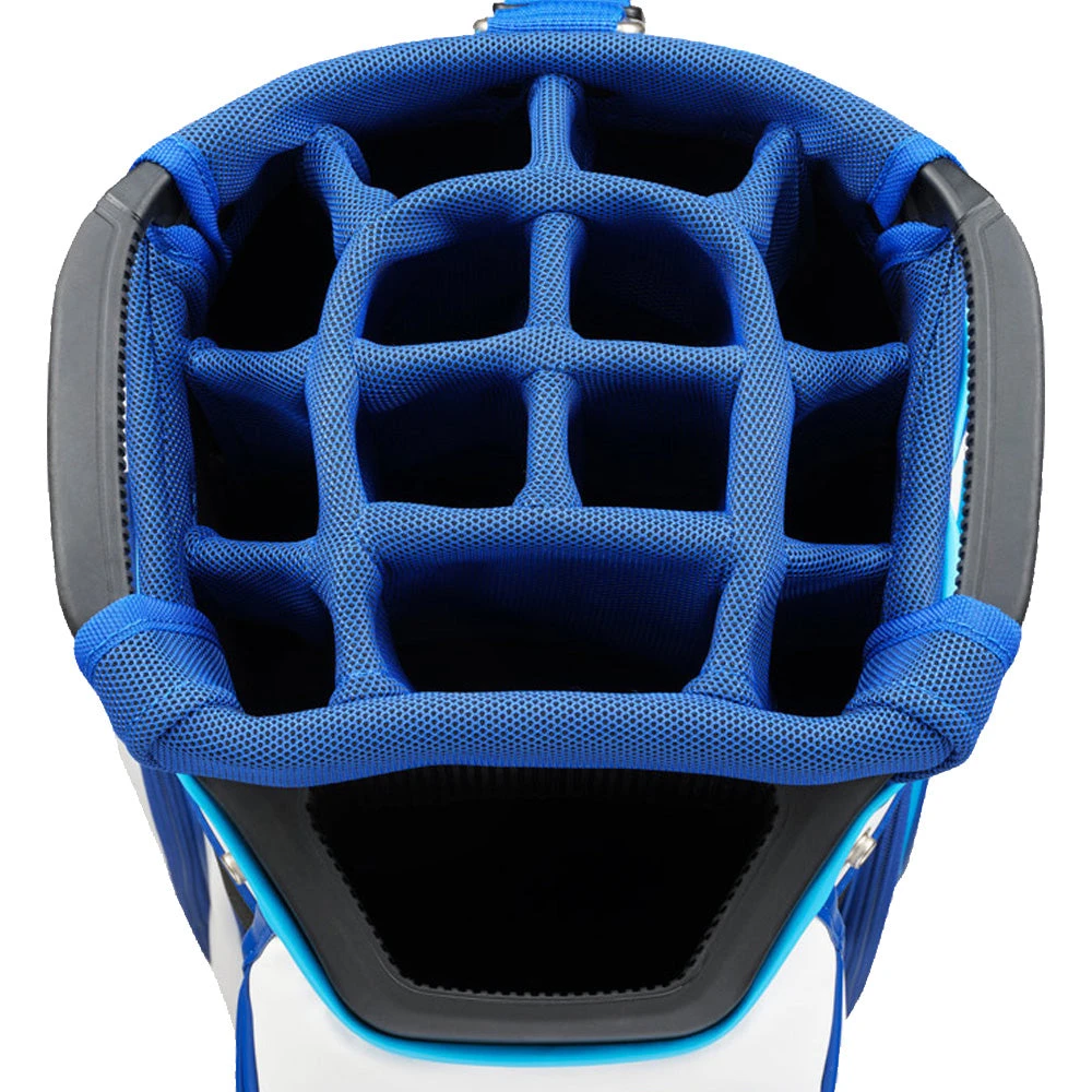 The bag has a 14-way, full length divider top with an integrated putter well, designed to keep your clubs organised whilst avoiding any snagging. There are rubberised grab handles moulded into the top cuff to easily transport the bag.