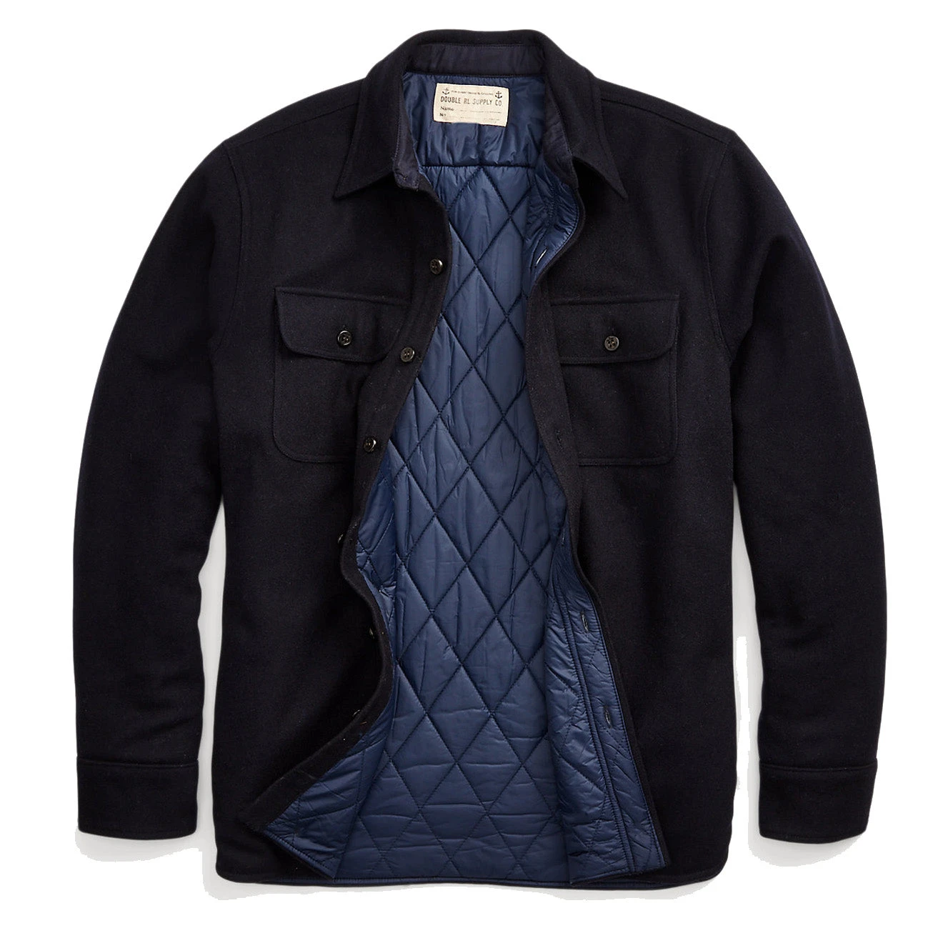 The RRL by Ralph Lauren Quilted Wool Melton Overshirt made from wool melton. Diamond-quilted lining. Inspired by ’40s surplus garments. Two chest pockets and side on-seam pockets. Anchor-etched corozo buttons.